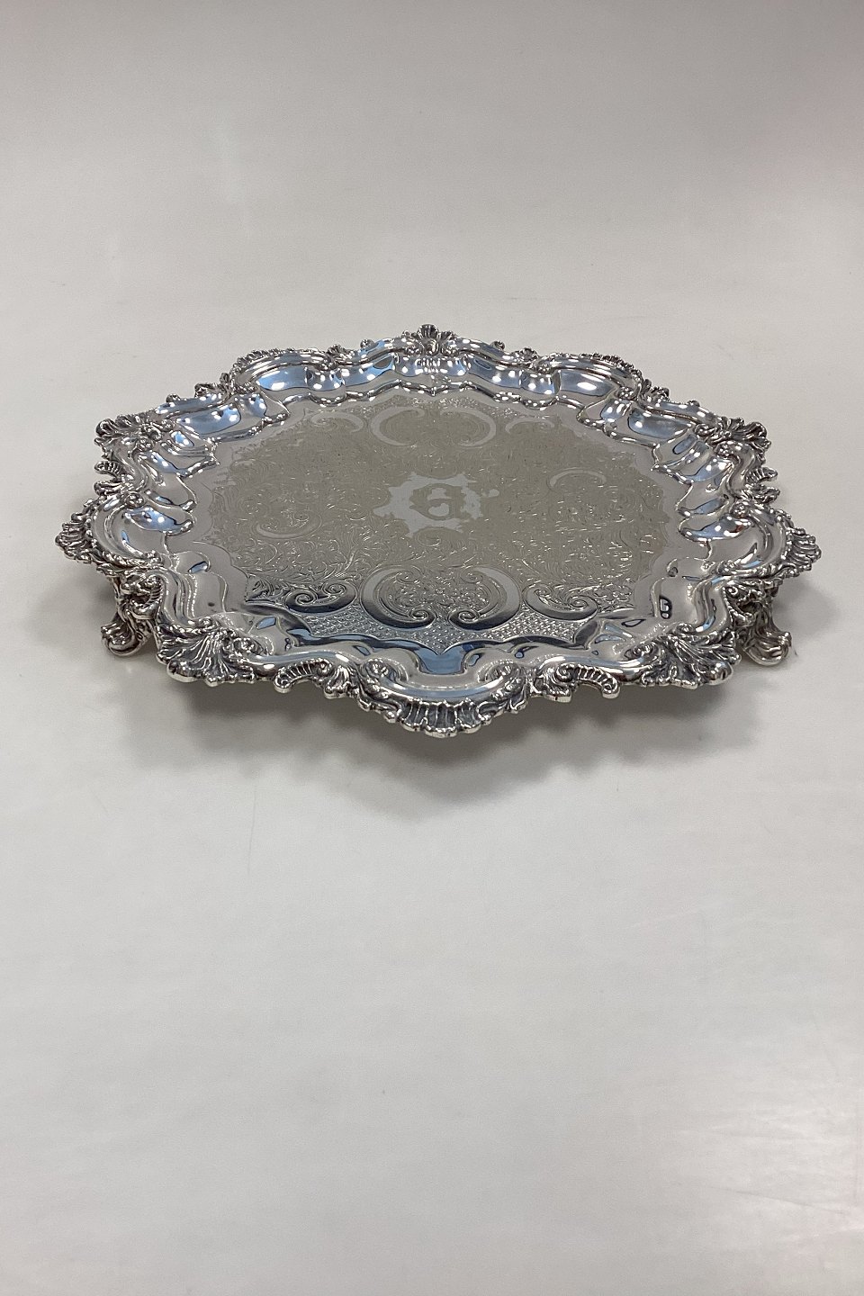 Ornamented English Silver Plated Serving Tray with Legs, Made in England.