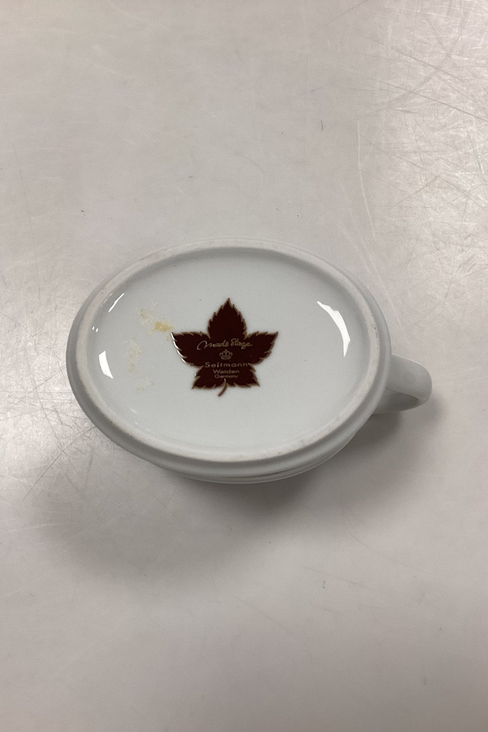 Measures H: 9.7 cm L. with handle 17 cm / H: 3.82 in. x L: 6.69 in.