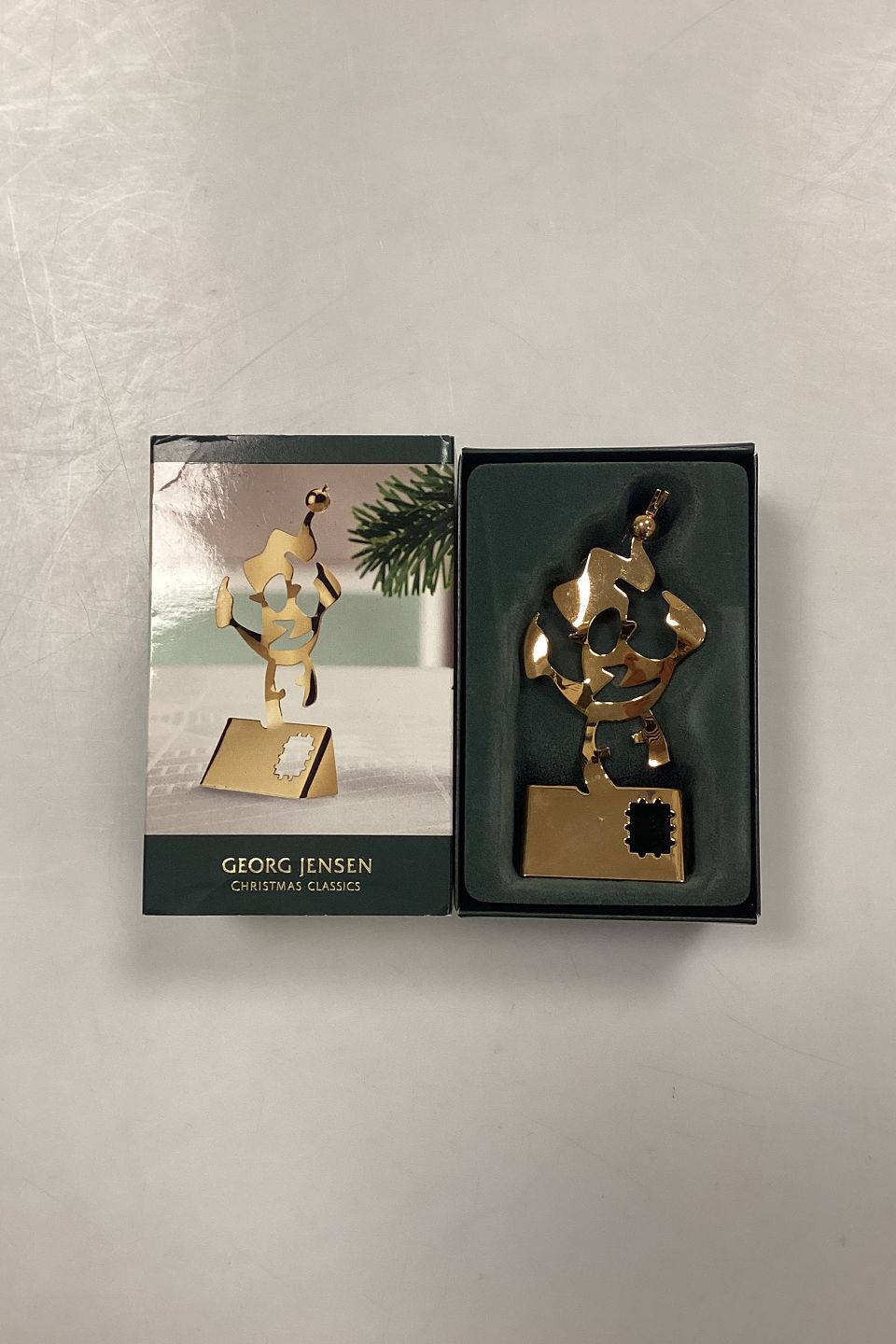 Georg Jensen Christmas Classics Christmas Ornament - Elf on Christmas Card. Designed by Leo Griffin. Steel plated with 24-carat gold.