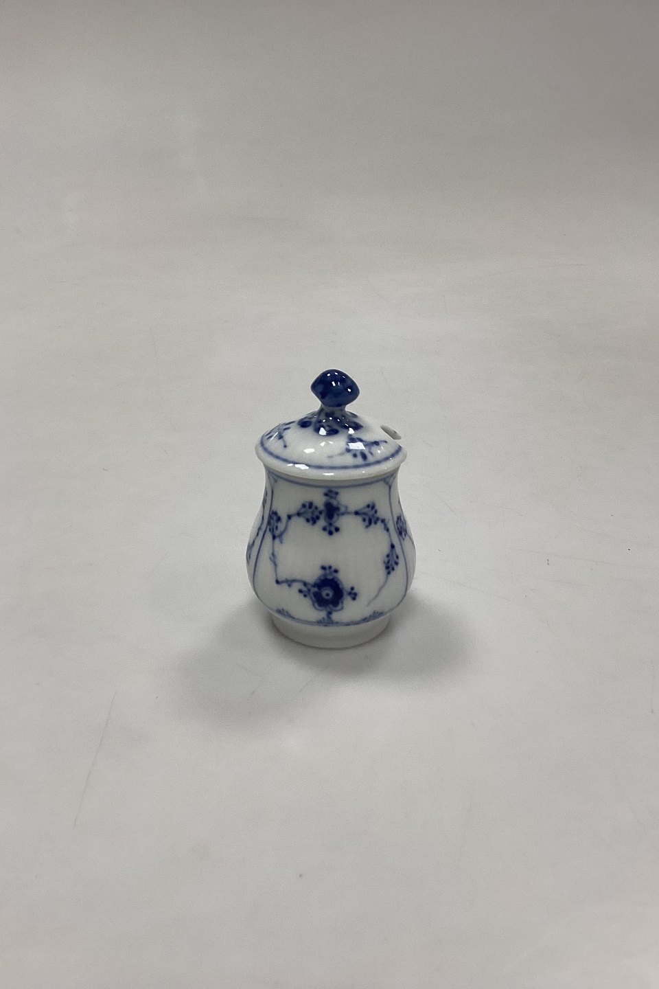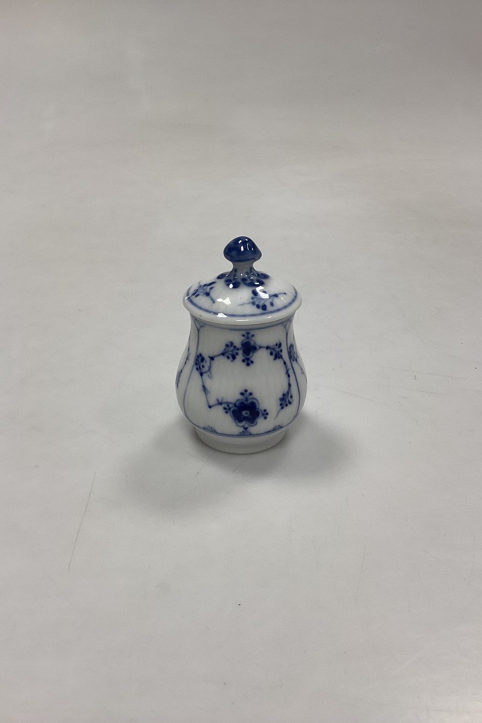 Royal Copenhagen Blue Fluted Plain Small Mustard Cup with Lid No. 358. Measures 7 cm / 2.75 in. 1st Quality