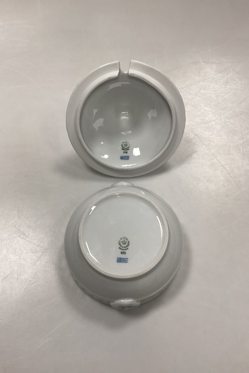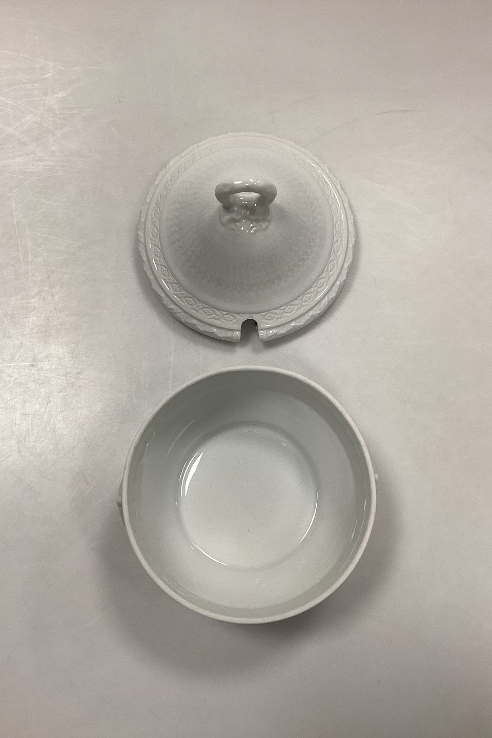 Royal Copenhagen White Fan Compote Bowl with Lid No. 170/171. Measures 13.5 cm x 14 cm / 5.31 in. x 5.51 in.
