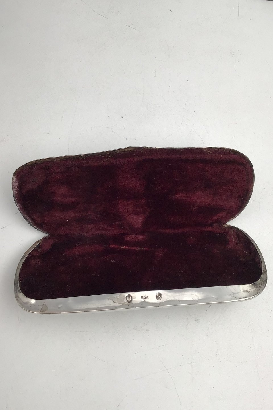 Hugo Grün Silver Spectacle Case (1933) Measures 13.8 cm x 5.8 cm x 2 cm (5.43 inch x 2.28 inch x 0.78 inch) Weight 80 gr (2.83 oz) (Engraved / Signs of usage)