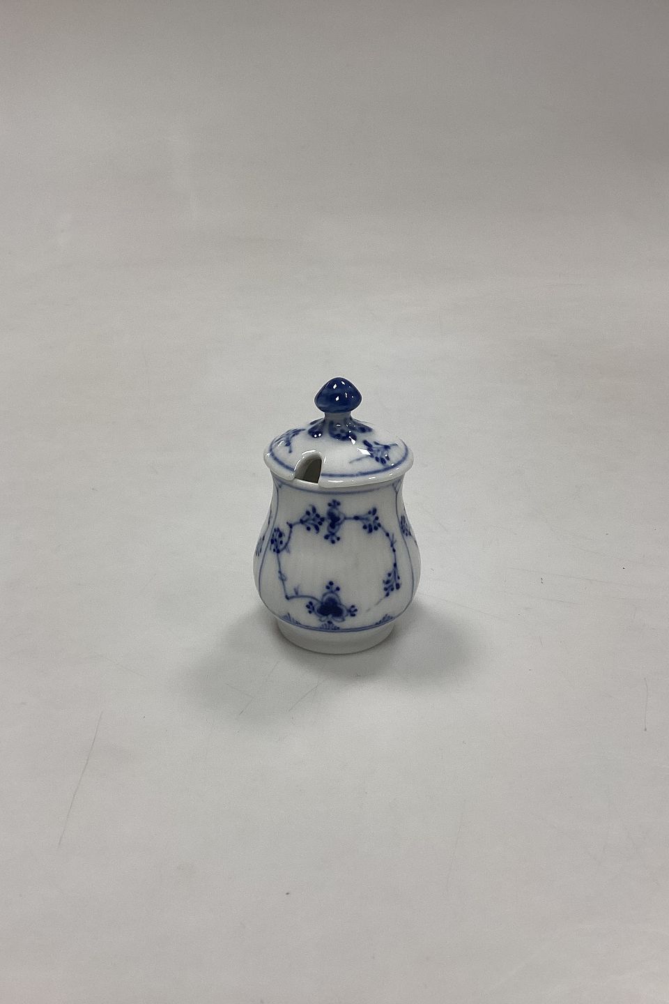 Royal Copenhagen Blue Fluted Plain Small Mustard Cup with Lid No. 358. Measures 7 cm / 2.75 in. 1st Quality