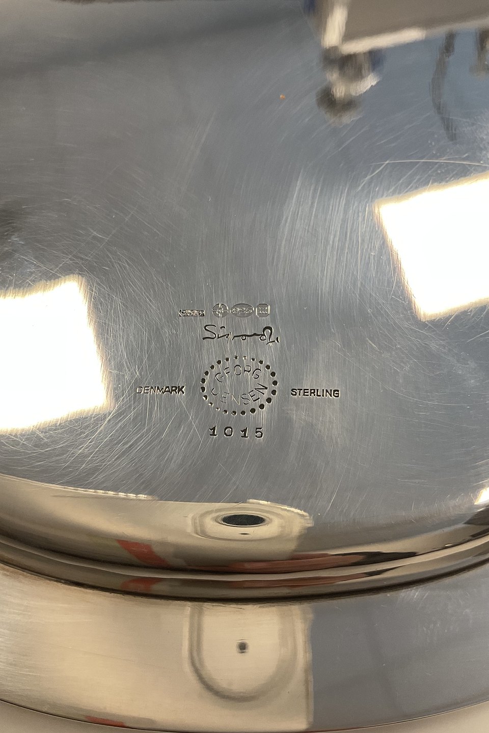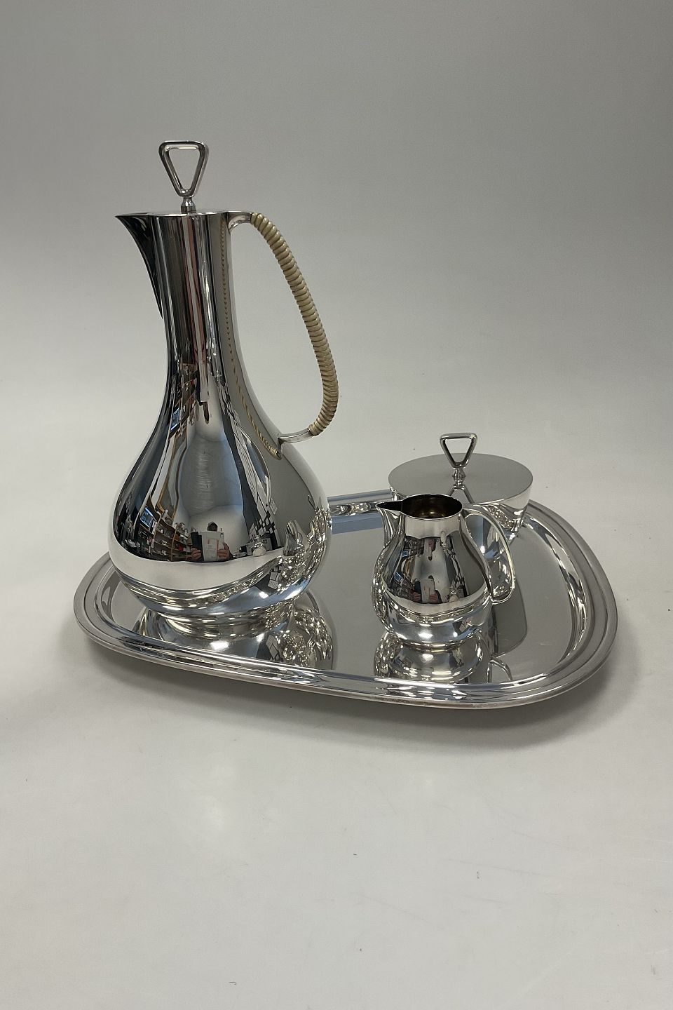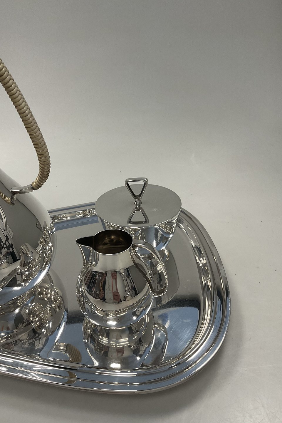 Georg Jensen Sterling Silver Coffee Set with tray No 1015 Sigvard Bernadotte Measures Coffee Pot H 23.5 cm(9 1/4 in) Sugar Bowl H 7 cm(2 3/4 in), Creamer H 7 cm(2 3/4 in), Tray 28,5cm x 24,5cm / 11.22 inch x 9.65 inch