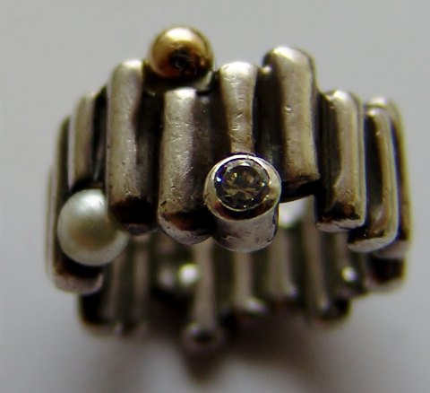 Hans Henrik Nygaard Unique Sterling Silver ring with pearl, stone and Gold-pearl. Good condition. Ring size 53.