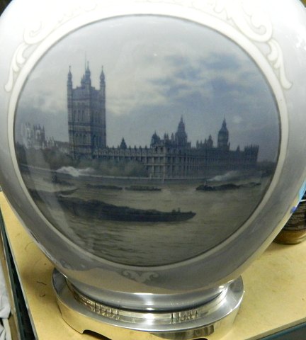 Royal Copenhagen Unique vase by Richard Bøcher from 1924. Motifs are Westminster and Kronborg. Silvered Bronze lid and stand by Knud Andersen. The price is without the lid and stand. Measures 33 cm x 39 cm / 13 in. x 15.35 in. without lid.