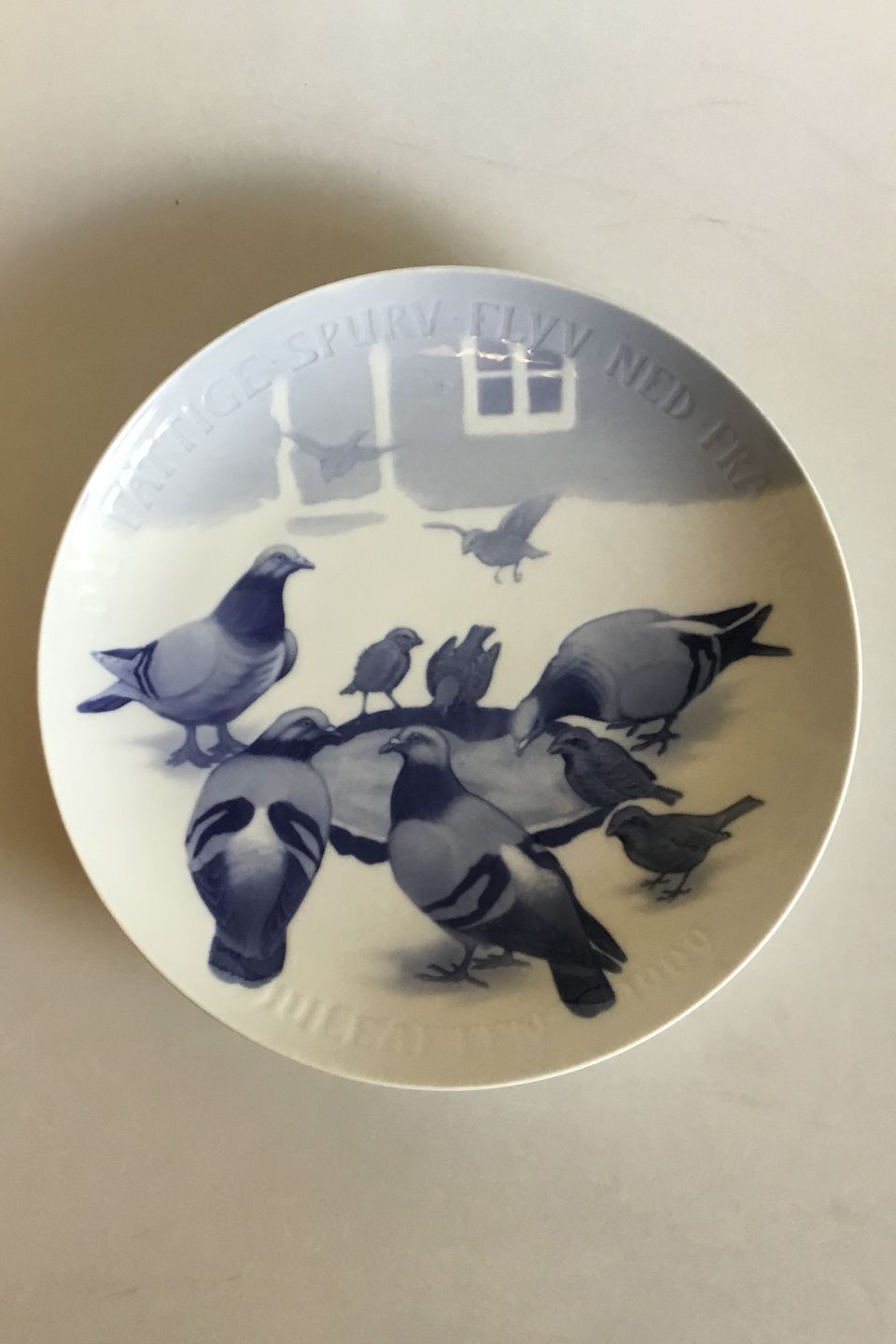 Bing & Grondahl Large Christmas Plate 1909 BG-L1909. Poor Sparrow fly down from the roof. Measures 33 cm / 12 63/64 in.