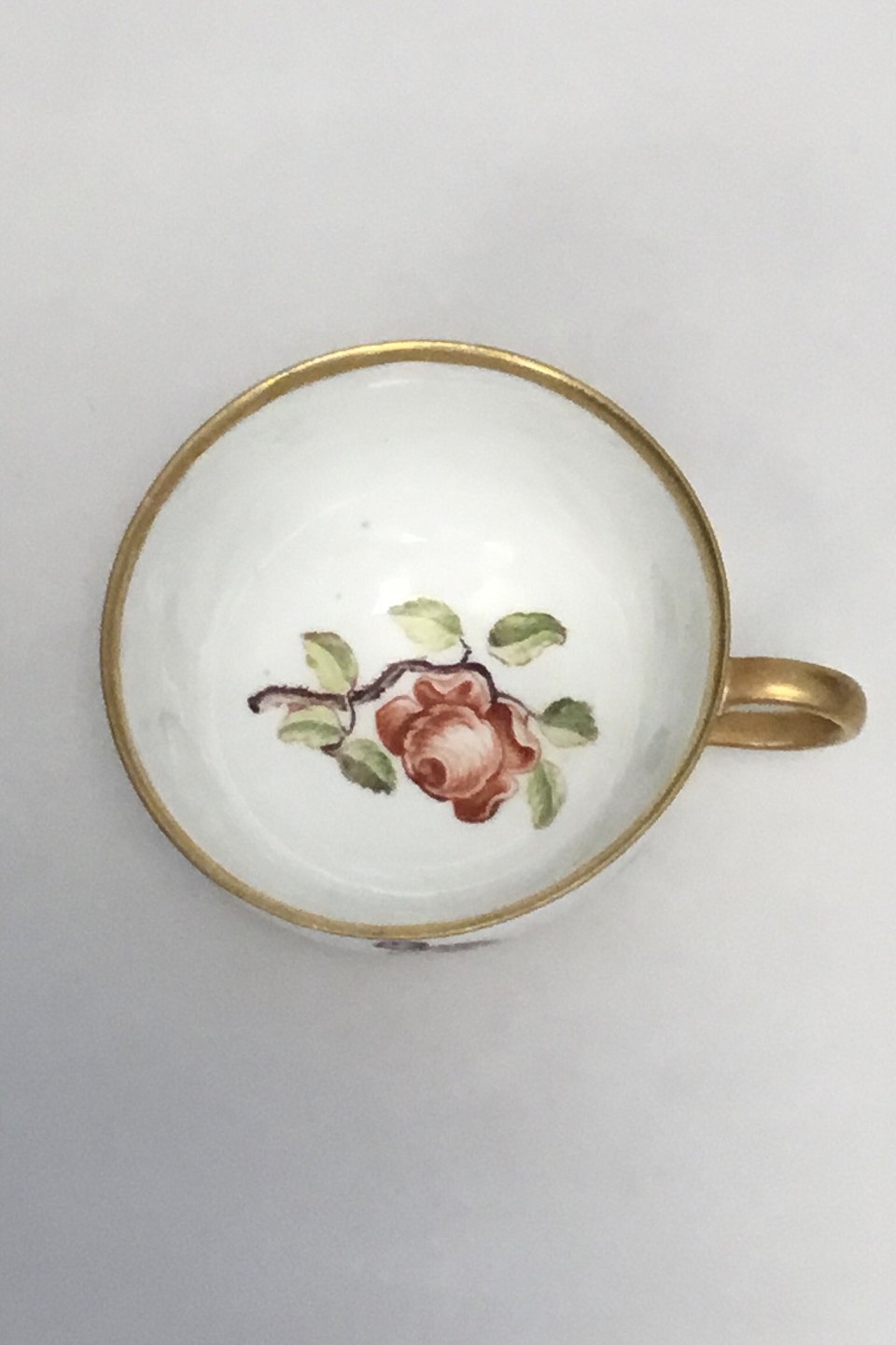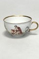 Meissen Porcelain cup in over glaze with mythological scenery. Depicted a munk pouring water into a basin from a jar with a lion head motive. Also a running youngster with hoof formed feet. The inside painted with a rose, underneath a blue Meissen mark. H: 4.5 cm (1 49/64"). Few very small dents on the foot rim.
