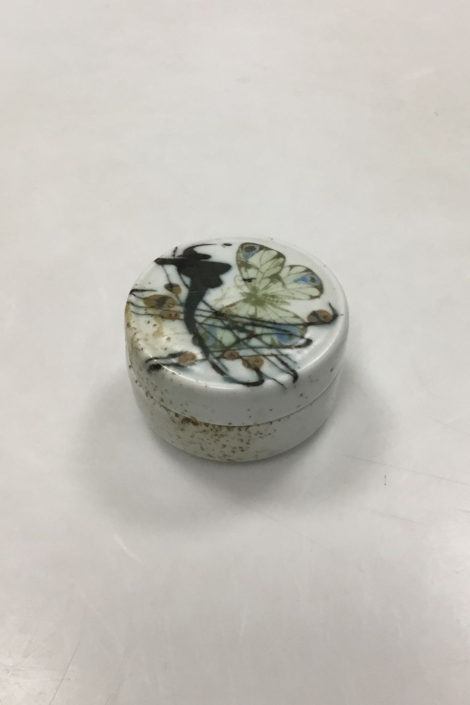 Royal Copenhagen Stoneware Small Box No 1055/5325. Designed by Nils Thorsson, decorated with Butterfly. Measures 6 cm / 2.36 in.