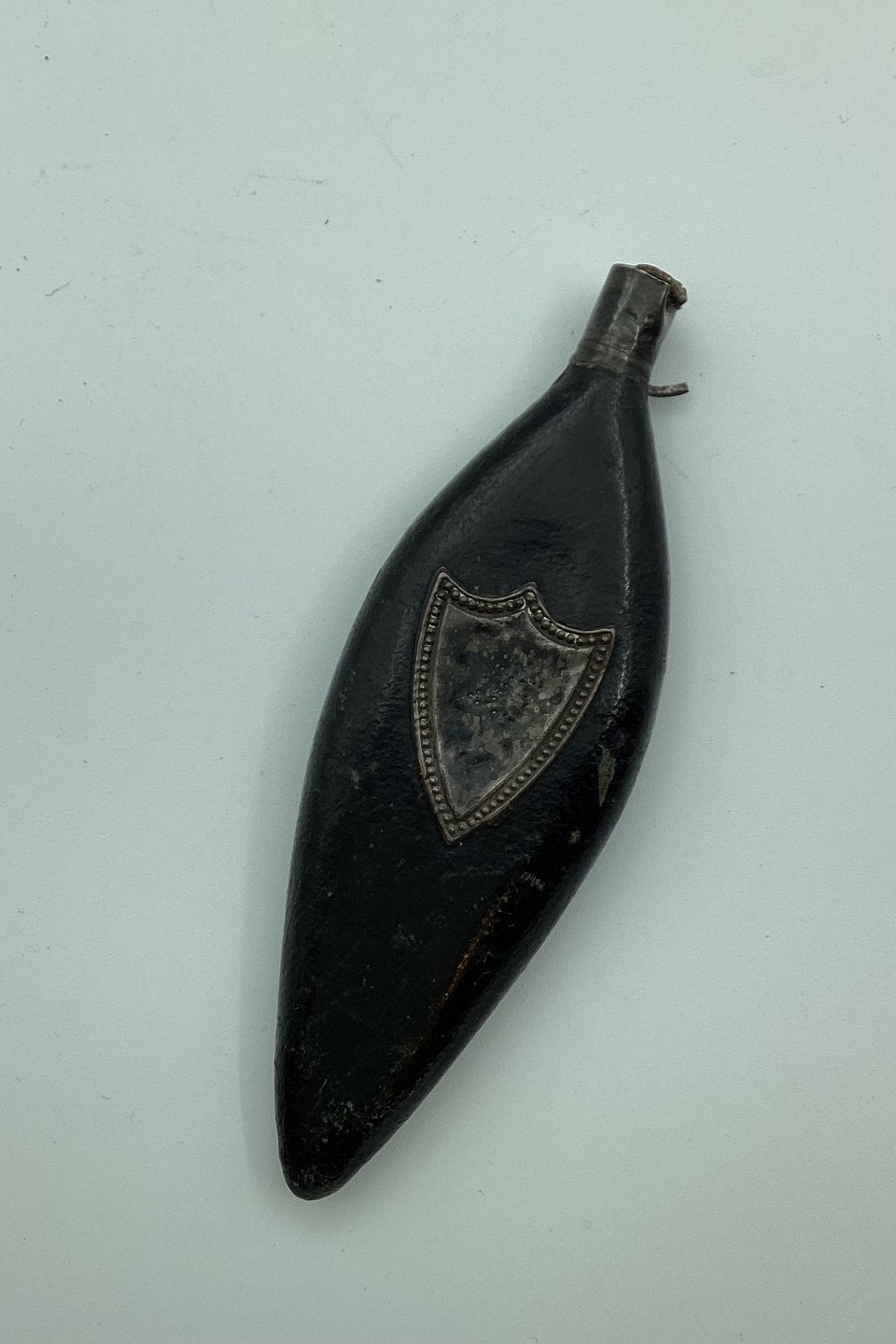 Leaf-shaped leather-covered perfume bottle 1803. Shields of silver on each side. Owner initials and the year 1803. In good condition. Length 11 cm (4.33 inches)