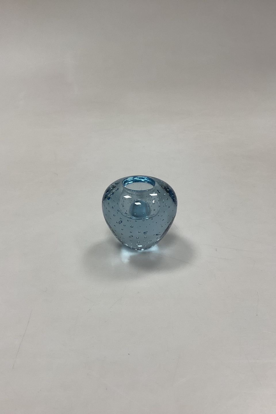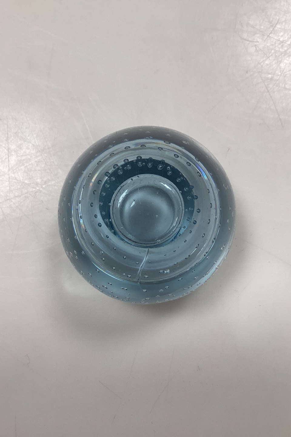Small Glass Candle Holder with Bubbles. Probably Scandinavian from the 1950s. Color: Light blue. Small scratches and a casting crack on the side. Measures 5 cm / 1.96 in.
