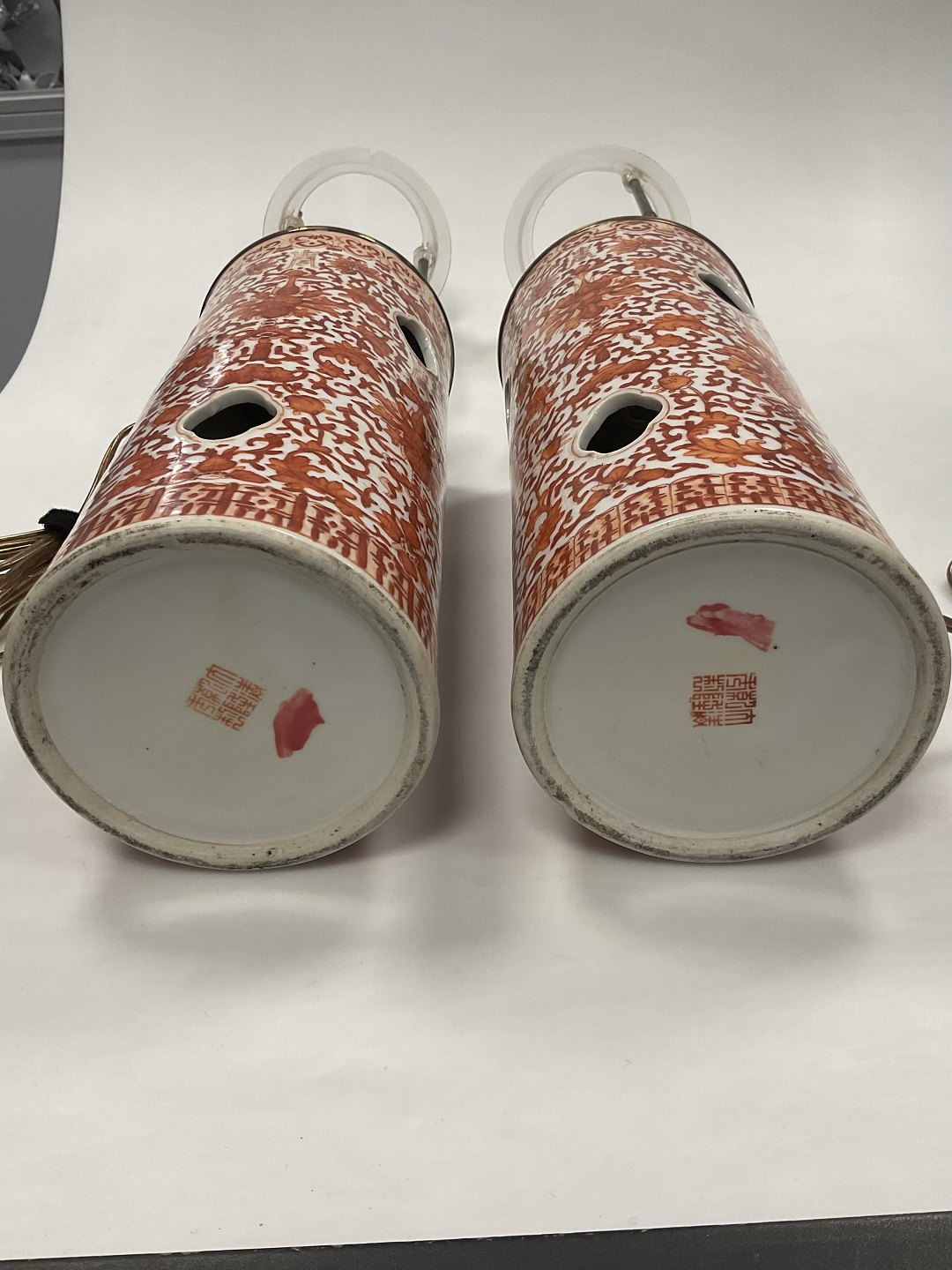 Chinese Oriental Pair of Lamps in Iron Red Decoration Qianlong