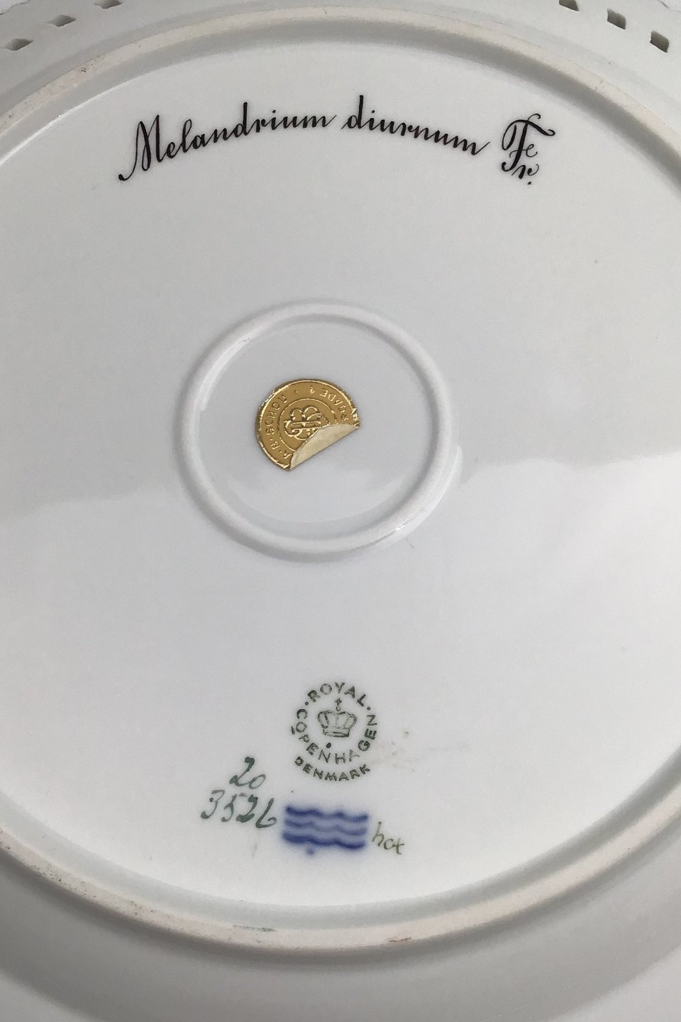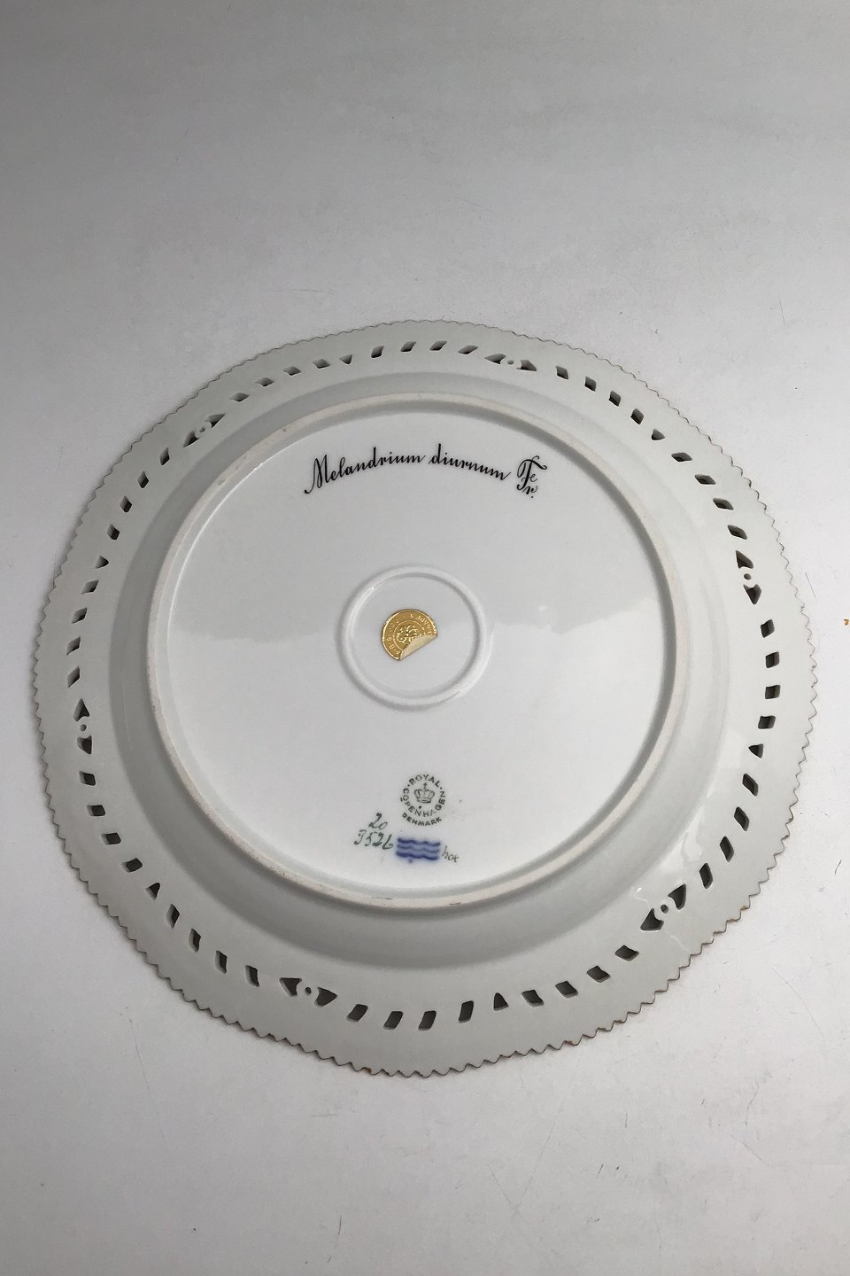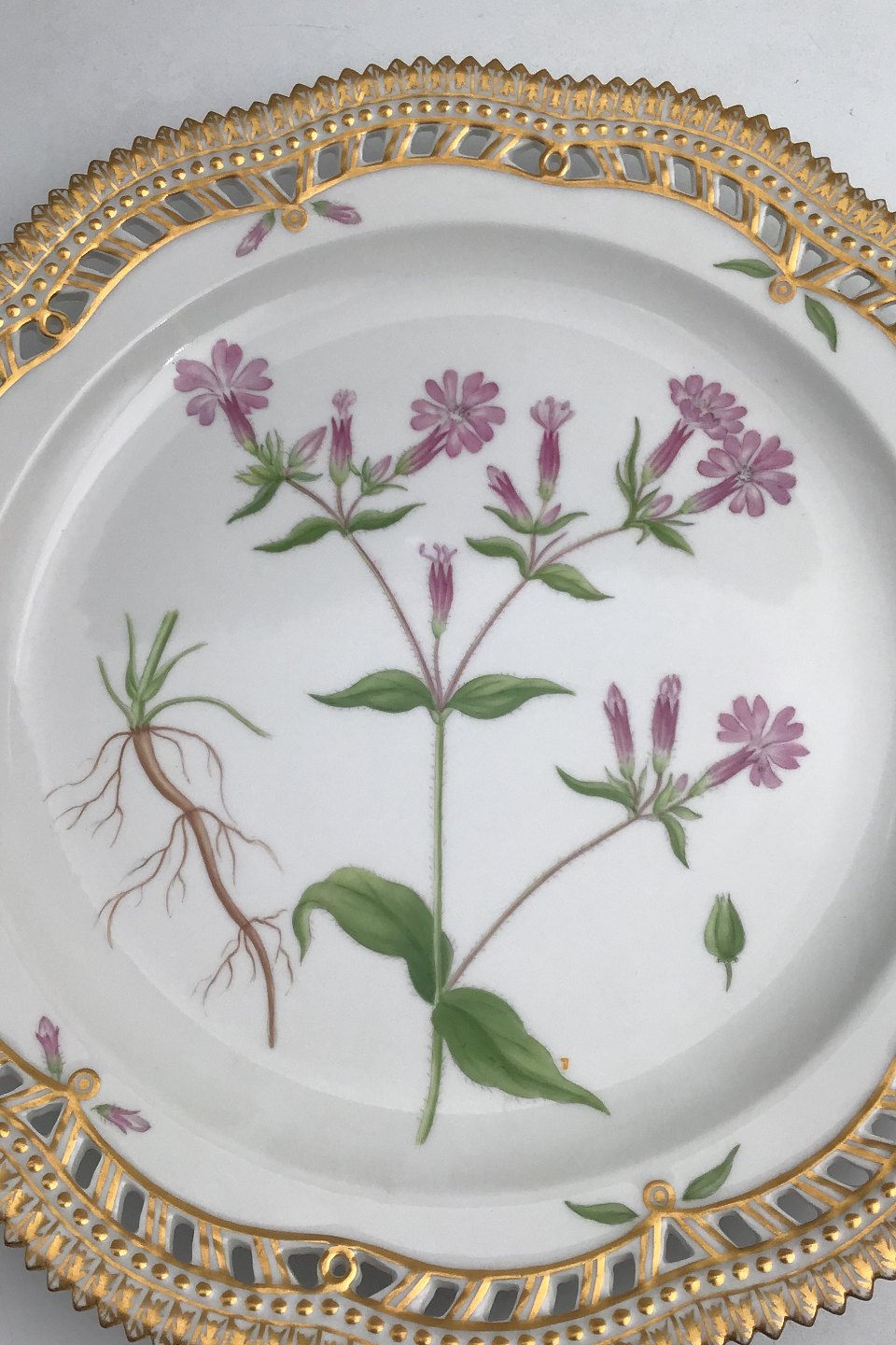 Royal Copenhagen Flora Danica Plate with pierced border No. 20/3526. Measures 27cm / 10.63 inch. 1st Quality Latin name: Melandrium diurnum Fr.