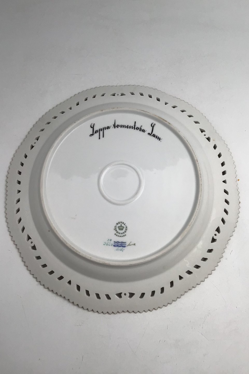 Royal Copenhagen Flora Danica Plate with pierced border No. 20/3526. Measures 27cm / 10.63 inch. 1st Quality Latin name: Lappa tomentosa Lam